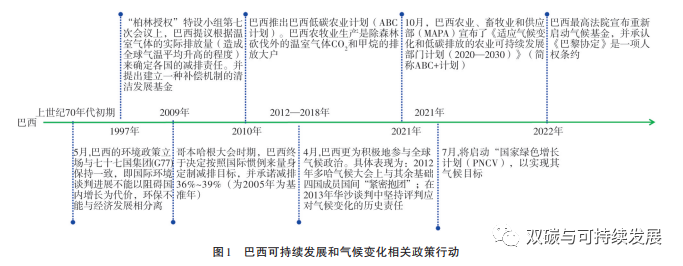 作为1992年首届世界环境发展大会的举办地,巴西高度重视可持续发展与气候变化工作,积极制定和实施了一系列应对气候变化的政策与行动(图1),推动温室气体减排进程取得新进展。巴西的气候变化政策和立场经历了三个阶段:拒绝和抵制阶段(1972—1989年)、建设性参与阶段(1990—2003年)、积极推动阶段(2003年至今)。在这三个阶段中,巴西对气候变化问题的认知、国内应对政策和国际谈判立场都出现不同的变化,表现为从消极参与向积极推动转变的过程。
